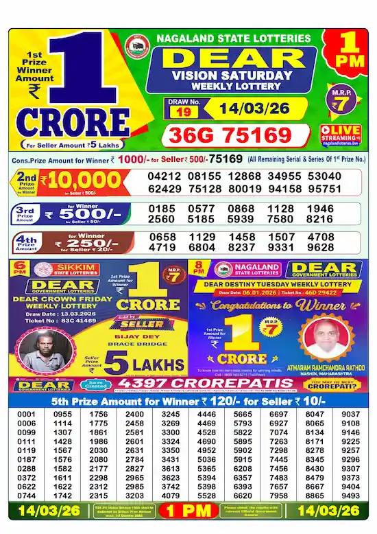 Dear Lottery is one of India’s most popular government lotteries, known for its transparent draws and life-changing prizes. The Nagaland State Lottery, along with Sikkim and West Bengal, conducts three draws daily-Morning (1 PM), Evening (6 PM), and Night (8 PM)-offering participants multiple chances to win big every day